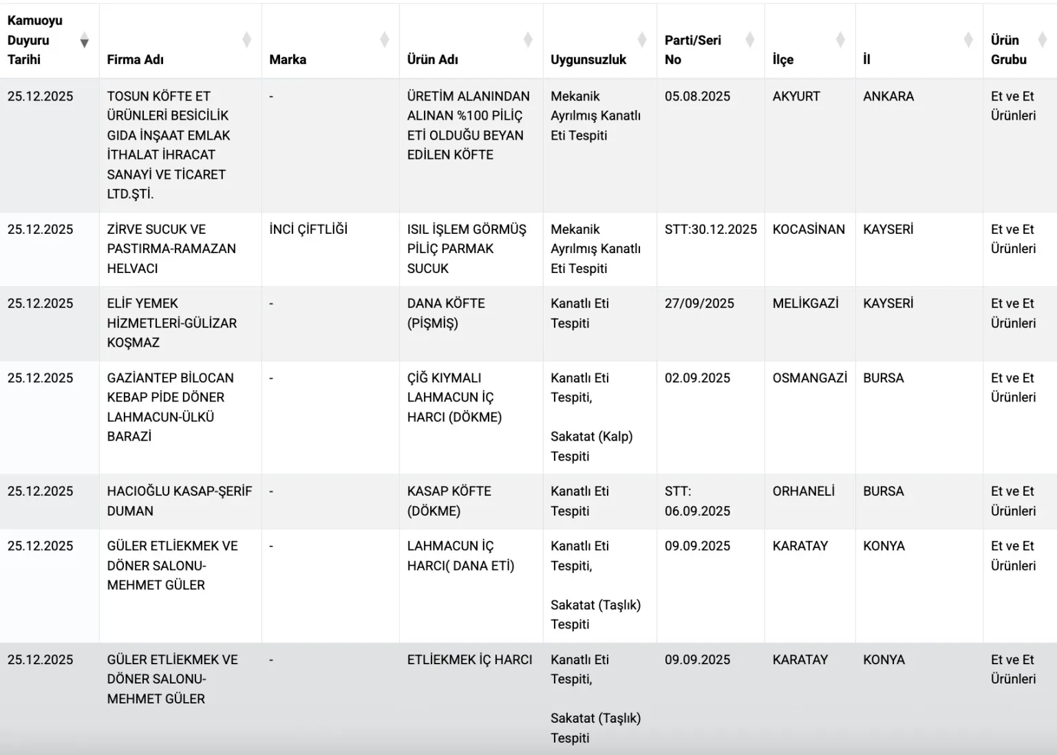 Bakanlığın 25 Aralık 2025’te ‘taklit veya tağşiş yapılan gıdalar’ listesine eklediği et ve et ürünlerini açıkladı.