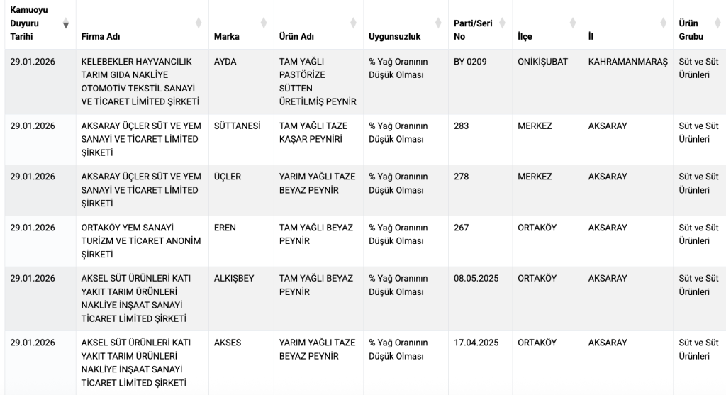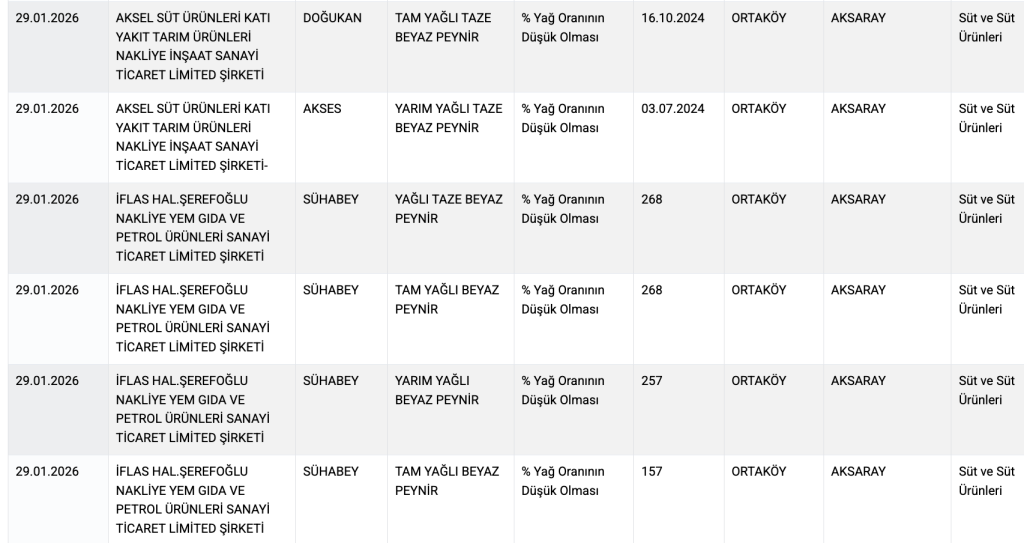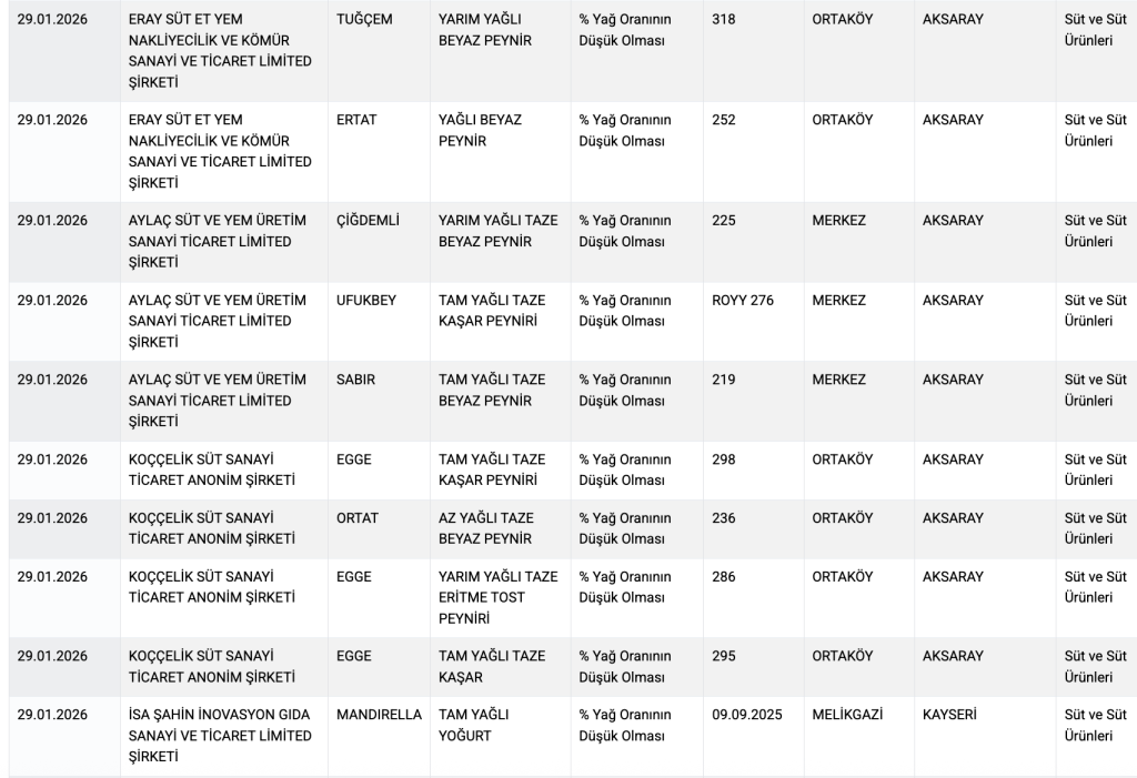 Buna göre 29 Ocak 2026’da ‘Taklit veya Tağşiş Yapılan Gıdalar’ listesine bitkisel yağ tespiti nedeniyle eklenen peynir ve tereyağı markaları şunlar:
